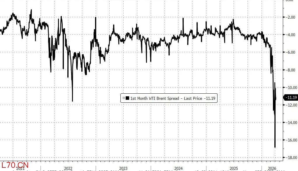随着全球航运路线的不确定性持续上升,WTI原油实际上已获得一种“安全溢价”,其相对布伦特的传统折价不仅大幅收窄,甚至出现反转。分析人士指出,当前的价格倒挂表明,与实物流通挂钩的正常定价信号已出现结构性失灵。
