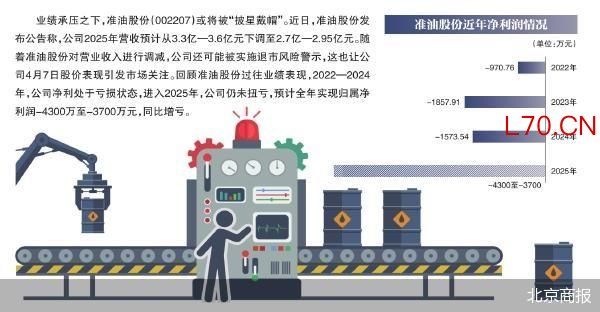 业绩承压之下,准油股份(002207)或将被“披星戴帽”。近日,准油股份发布公告称,公司2025年营收预计从3.3亿—3.6亿元下调至2.7亿—2.95亿元。随着准油股份对营业收入进行调减,公司还可能被实施退市风险警示,这也让公司4月7日股价表现引发市场关注。回顾准油股份过往业绩表现,2022—2024年,公司净利处于亏损状态,进入2025年,公司仍未扭亏,预计全年实现归属净利润-4300万至-3700万元,同比增亏。